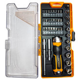 این ست ۳۸ عددی شامل یک عدد پیچگوشتی بکسی و ۳ عدد رابط و ۱۰ عدد بکس درایو ۱/۴ به شماره های ۴ - ۵-۶ - ۷ - ۸ - ۹ - ۱۰ - ۱۱ - ۱۲ - ۱۳ و سه عدد سری الن H۳ - H۴ - H۵ , ۵ و ۵ عدد بیت ستاره T۱۰ - T۱۵ - T۲۰ - T۲۵ - T۳۰ و ۹ عدد چهار گوش PH۰ - PH۱ - PH۱ - PH۲ - PH۲ - PH۲ - PH۳ - PH۳ , PZ۱ - PZ۲- PZ۳ , و ۴ عدد سری پیچ گوشتی ۳MM-۴MM-۵MM-۶MM-۷MM میباشد این ست دارای کیفیت ساخت بسیار بسیار بالایی دارد و از الیاژ کروم وانادیوم تولید شده است